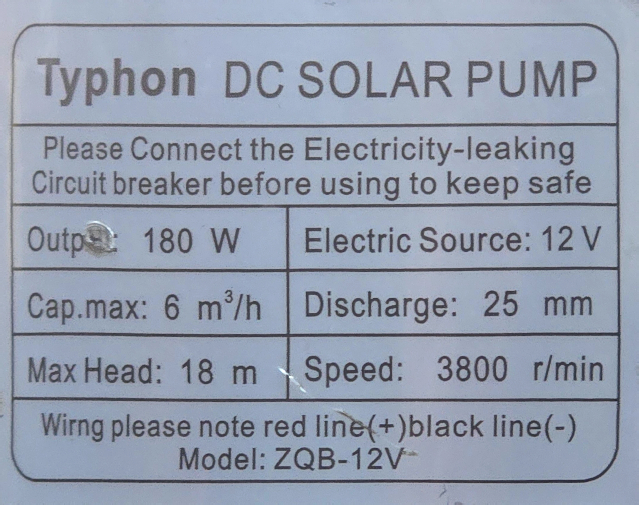 ولتاژ۱۲ ولت DCحداکثر آبدهی۶ متر مکعب بر ساعتحداکثر ارتفاع۱۸ مترگیره اتصال به سر باترینداردتوان۱۸۰ وات